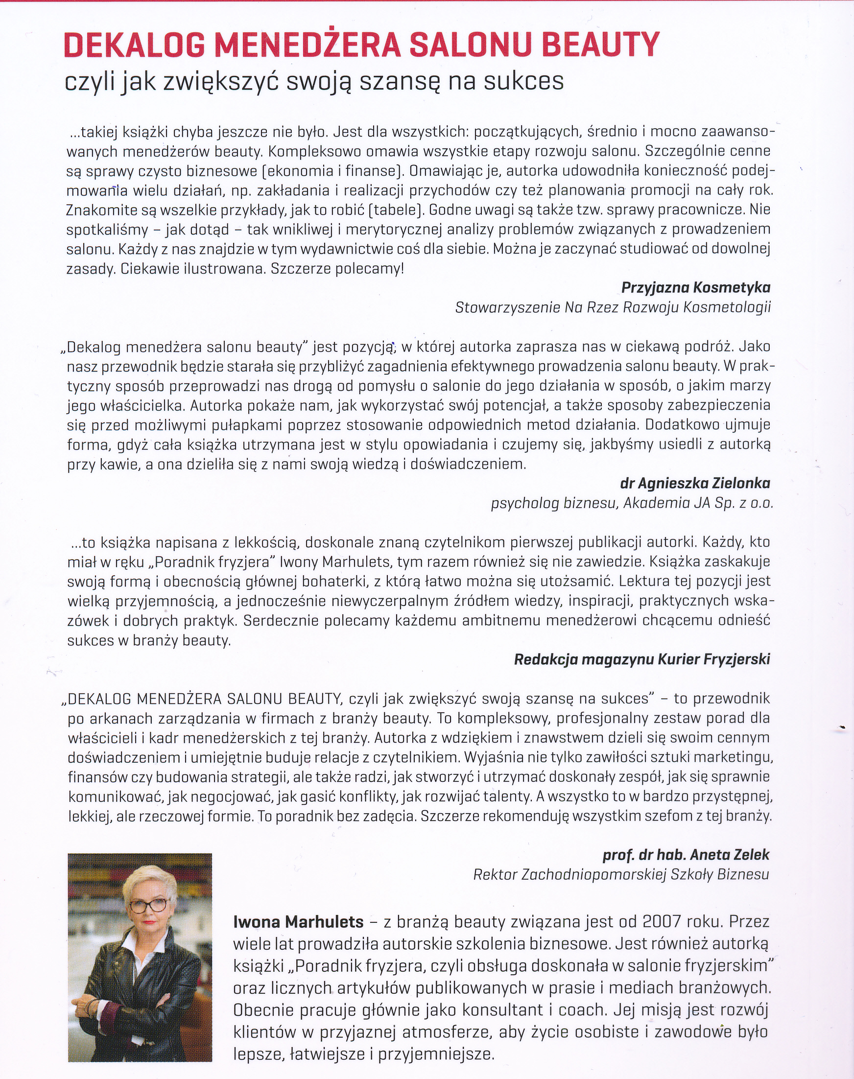 Książka przeznaczona jest dla każdego. Mówi czym jest zarządzanie marką salonu, pracownikami i samym salonem.