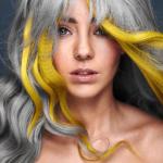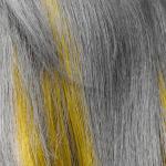 Kolekcja jest też przykładem kontrastu symultanicznego. Zastanówcie się, jak odbieracie te same CZYSTE kolory kiedy znajdują się w otoczeniu innych barw. Żółte pasma w towarzystwie bardzo ciemnego brązu (czerni europejskiej) sprawiają wrażenie jaśniejszych i bardziej świecących, natomiast w zestawieniu z szarym, który stanowi jaśniejsze tło, wydają się ciemniejsze i bardziej zgaszone. Z kolei szare pasma na tle czarnej masy włosów wyglądają bardzo jasno, a w towarzystwie żółtego zdecydowanie ciemniej. (dop. red. SUZI, projektowanie fryzur, kontrasty, FRK.03)